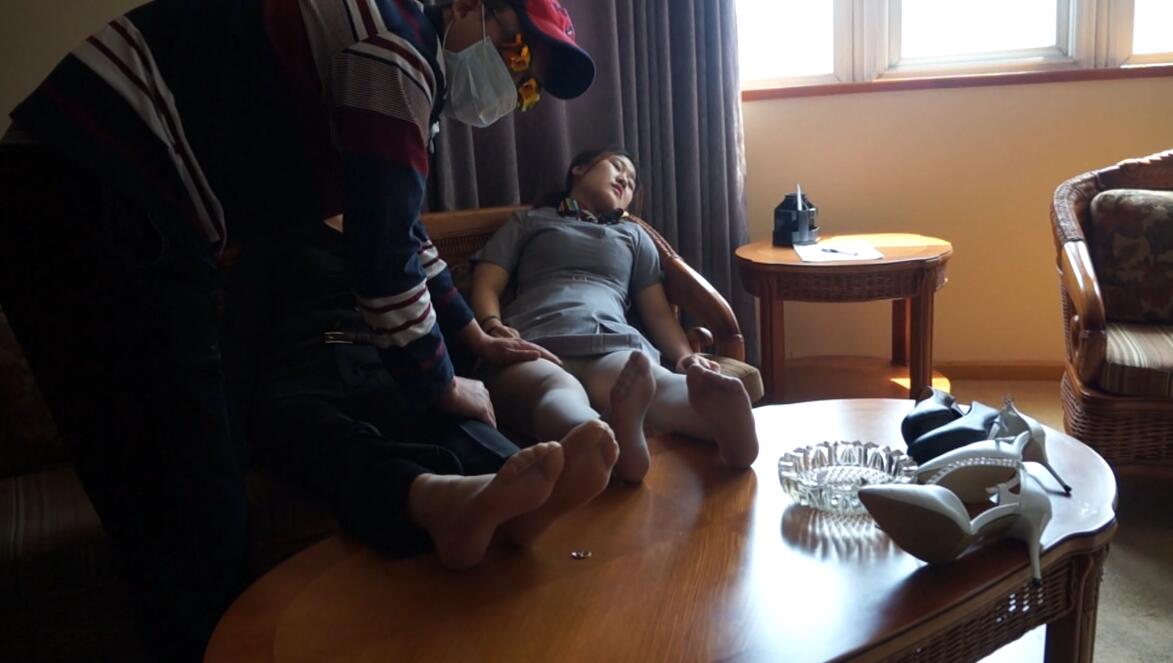 两姐妹宾馆里被蒙面大叔用药迷昏,拉到床上玩弄性感丝足