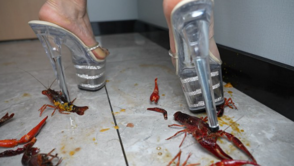 高跟凉鞋踩踏羞辱小龙虾,残忍踩烂每一个小龙虾。