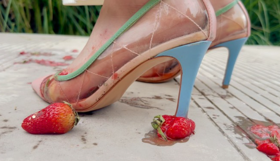1)高跟鞋前脚掌慢慢左右碾踩 2)用鞋跟戳草莓,给草莓扎洞 3)正面,特写镜头,用脏脏的鞋底踩下去,清晰地看到鞋底的汁水