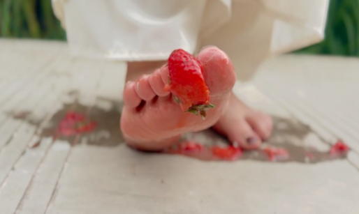 1.2 正面拍特写,用大拇指慢慢碾压,让草莓爆汁,同时用脚趾叼起草莓,喂食给屏幕前的狗,并进行裸足展示
