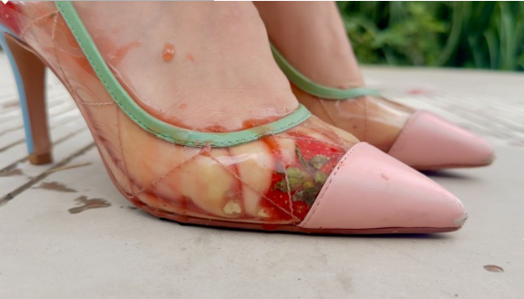 2.1 在透视高跟鞋中放入草莓,穿鞋,草莓会碾烂,拍特写脚进去以后从透明高跟鞋内,草莓被压得爆汁流出来到脚背的镜头...