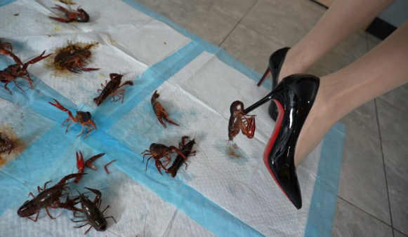 大长腿肉丝红底高跟踩踏小龙虾,边踩边羞辱,细跟扎踩,剁踩,把小龙虾踩的稀巴烂。